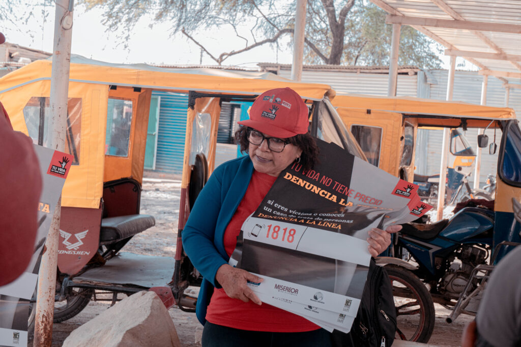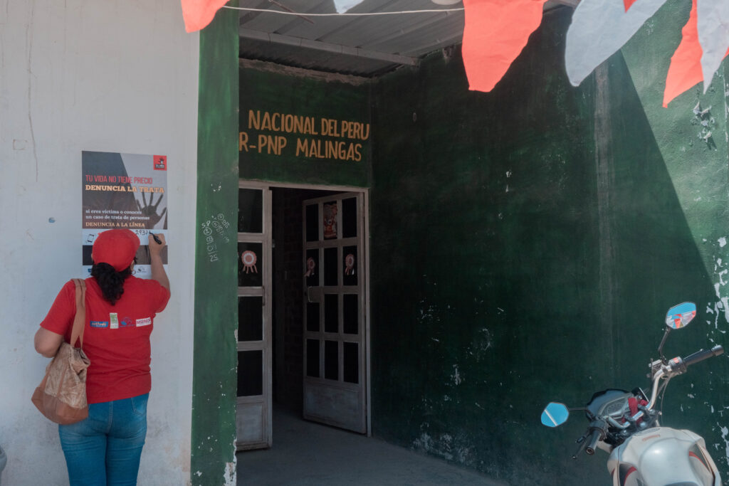 Esa mañana llegamos a Malingas, centro poblado de Tambogrande, para acompañar a la Red de Mujeres de este distirito en una de sus intervenciones preventivas contra la trata de personas. La misión era sencilla pero crucial: sensibilizar a la mayor cantidad posible de vecinos con una breve charla y, después, colocar carteles con los números de la línea 1818, en la que se puede denunciar casos de trata de personas, y de la comisaría de Tambogrande.