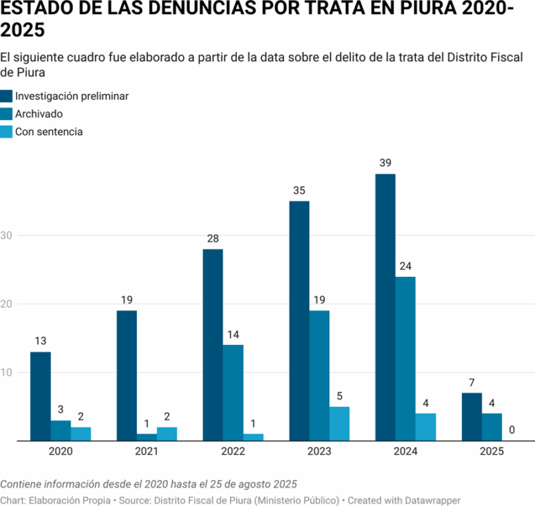 En 2020, cuando aún no existía la FISTRAP, se registró un reporte de 21 casos, de los cuales 13 pasaron a investigación preliminar, tres fueron archivados y se lograron dos sentencias. Mientras que desde 2021 hasta agosto de 2025, la FISTRAP Piura registra un total de 121 casos en investigación preliminar, 58 archivados y apenas 14 sentencias por el delito de trata.