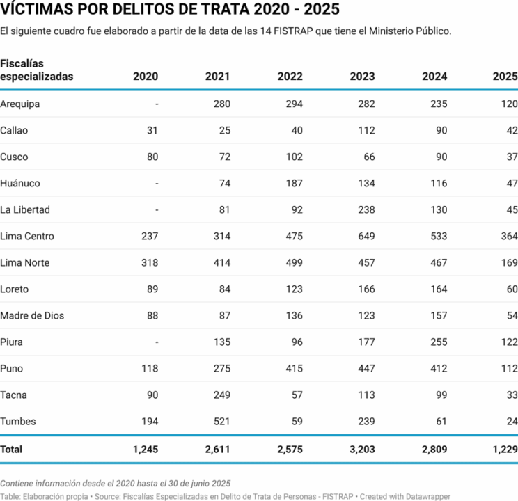 El anuncio a todo volumen era una forma de captación para la trata de personas, un delito cuyas víctimas suelen sufrir en silencio. Solo en 2024, el Ministerio Público registró 2,058 casos a nivel nacional. Esta información corresponde a 14 fiscalías especializadas del país: 4 en Lima y 10 distribuidas en distintas regiones. Piura es la región que concentra el mayor número de casos de trata después de Lima, la capital.