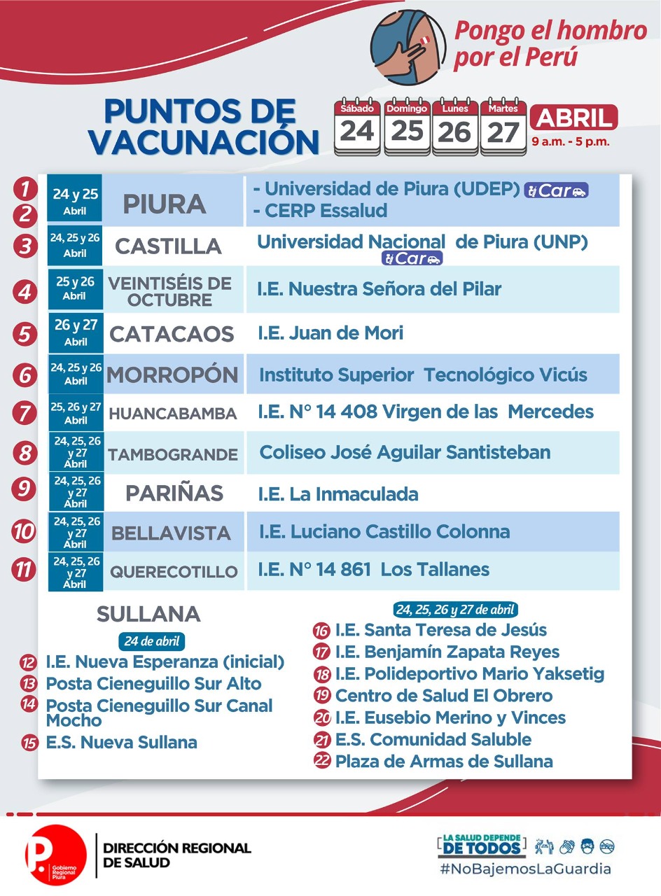 Luego de confirmarse la llegada de solo 9 mil 360 dosis de las más de 40 mil que el Gobierno Central anunció para Piura, el decano del Colegio Médico de Piura, Arnaldo Lachira Albán, señaló que la cantidad recibida sólo cubrirá el 27% de la población mayor de 80 años, es decir solo la tercera parte de los 40 mil que hay en toda la región. Por ello, a través de la Cámara de Comercio, el Consejo Regional de Decanos de los Colegios Profesionales de Piura – CONREDE, pidió la intervención del sector privado, con el fin de acelerar el proceso de vacunación.