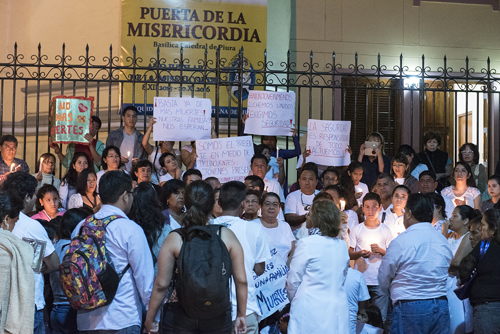 Previa a esta marcha por la paz, el sábado se realizó una vigilia en los exteriores de La Catedral que congregó a decenas de piuranos que expresaron su solidaridad con la familia de joven Luis Alfonso, fallecido de un disparo tras tratar de oponerse a un robo.