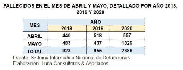 Para llegar a esta cifra, se comparó la cantidad de defunciones registradas en los meses de abril y mayo de los años 2018, 2019 y 2020.