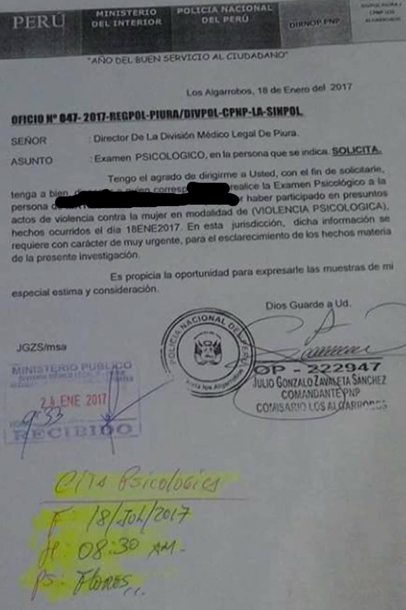A través de un oficio, el comisario del asentamiento humano Los Algarrobos de Piura, comandante Juan Zavaleta Sánchez, solicitó al director de la División médico legal de Piura que realice un examen psicológico a una mujer, a quien mantenemos su nombre en reserva, que el 18 de enero denunció haber sido víctima de maltrato psicológico por parte de su pareja.