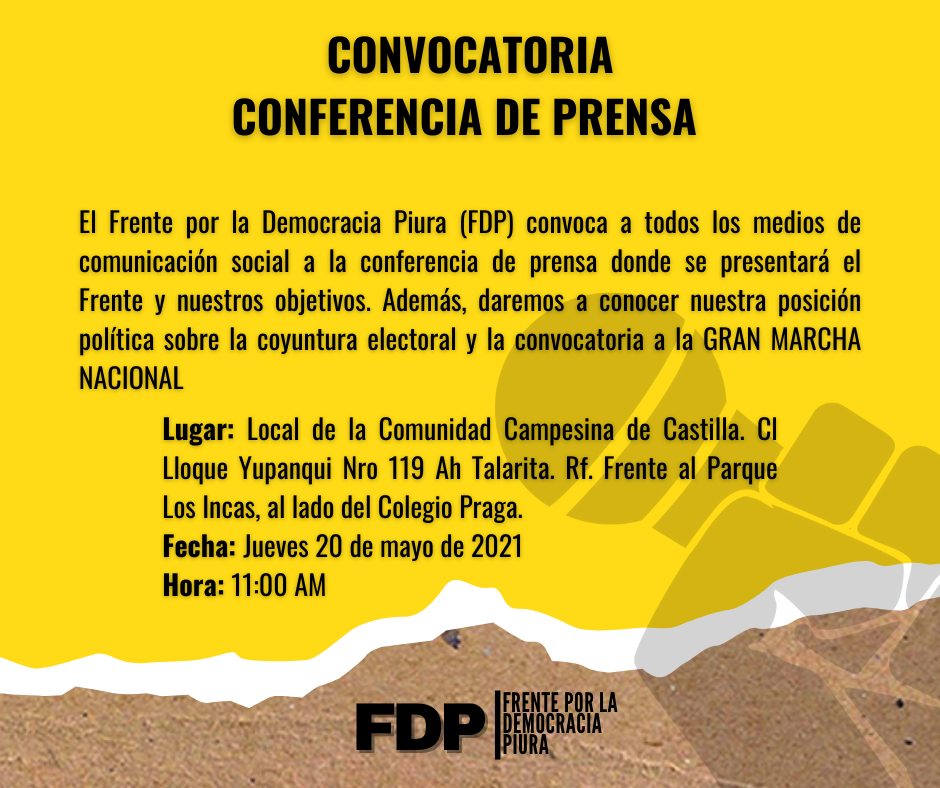 El Frente por la Democracia Piura dará una conferencia este jueves 20 de mayo en el local de la Comunidad Campesina de Castilla para presentar sus objetivos y su posición política ante la coyuntura electoral.