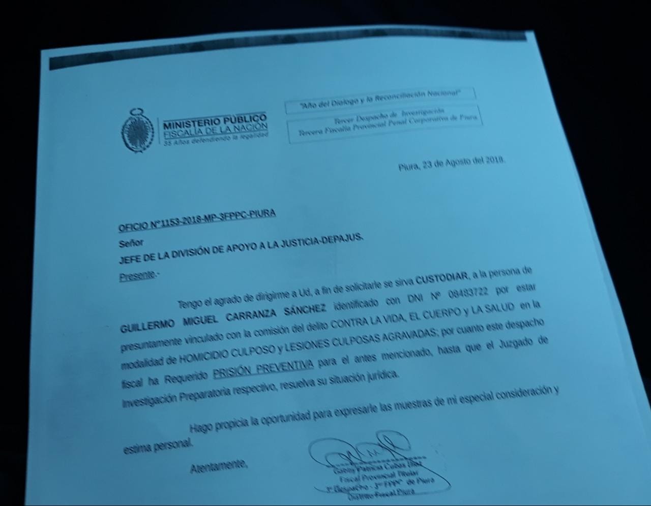 La fiscal provincial Gaby Cubas Díaz, a cargo del caso, emitió este jueves un oficio a la División de Apoyo a la Justicia (DEPAJUS) de la Policía para pedir que se custodie al brigadier Carranza por tener un pedido de prisión preventiva.