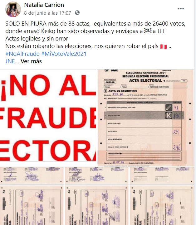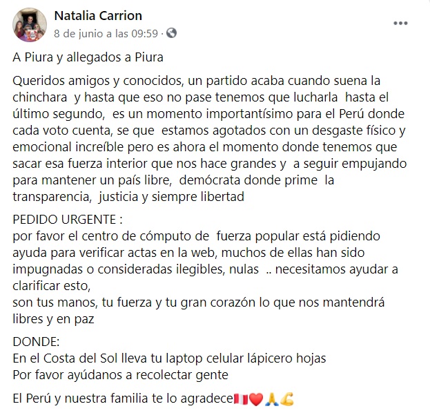 Horas antes de esta publicación, también realizó una convocatoria a un conocido hotel de la ciudad para verificar actas electorales. “El centro de cómputo de Fuerza Popular está pidiendo ayuda para verificar actas en la web, muchas de ellas han sido impugnadas o consideradas ilegibles, nulas… necesitamos ayudar a clarificar esto”, publicó en su cuenta de facebook.