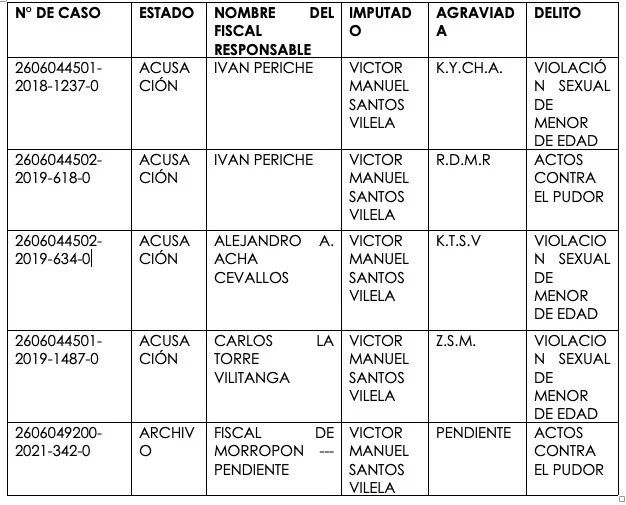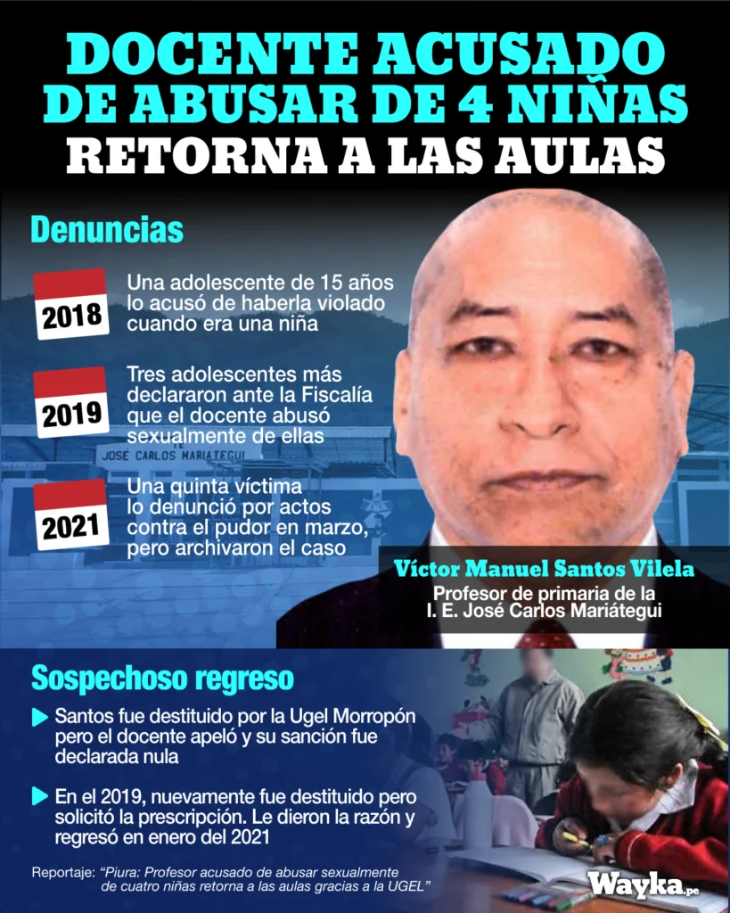 Han pasado más de tres años desde que iniciaron las investigaciones contra Víctor Santos por los abusos sexuales a sus cuatro exalumnas. El caso de Nicole se encuentra en estado de acusación por la Primera Fiscalía Provincial Penal Corporativa de Morropón (Caso Nro. 1237-2018), a cargo del fiscal Iván Periche Galán.