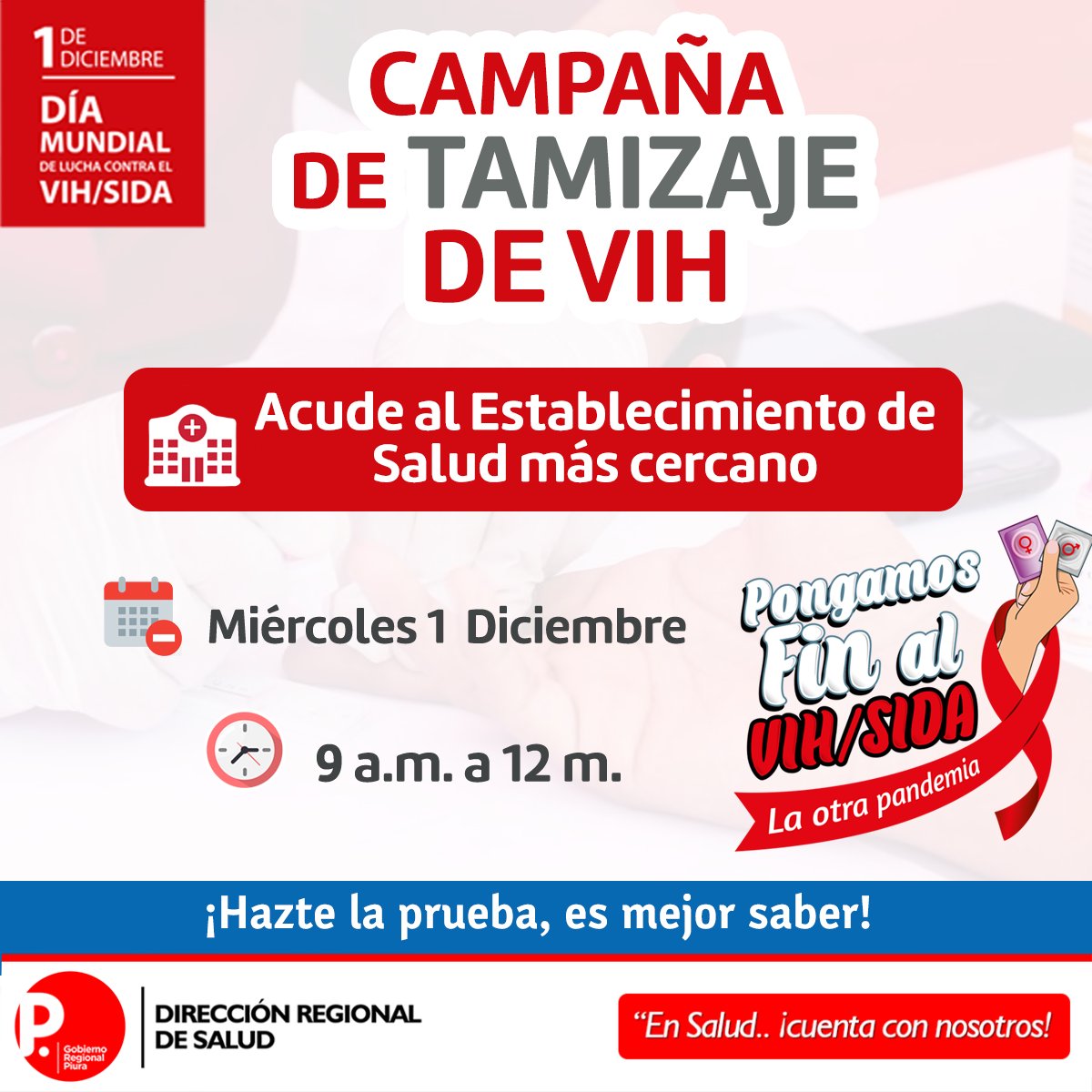 En el marco del  Día Mundial de la lucha contra el Sida, la Dirección Regional de Salud de Piura realizará una campaña de despistaje gratuito de SIDA este miércoles 01 de diciembre. Las personas de las provincias de Piura y Sechura podrán acercarse al centro de salud más cercano a su vivienda para realizarse la prueba.