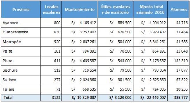 En el 2015, la región Piura recibió dos transferencias para mantenimiento: S/ 24 millones 513 mil para 3070 locales escolares como parte del programa regular y S/ 34 millones 122 mil a 3048 locales correspondientes al mantenimiento preventivo ante el Fenómeno El Niño.