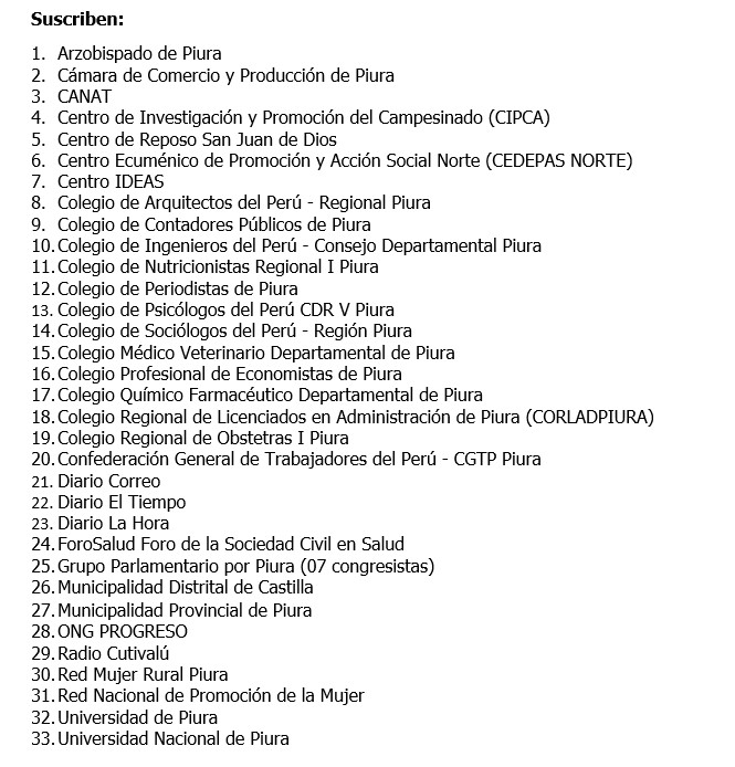 Ante el incontenible y trágico avance de la pandemia de COVID-19 en la región Piura, cuya tasa de letalidad es de 9.61%, el Colectivo Cívico Institucional por el Respeto que Merece la Región Piura, instituciones de la sociedad civil, y congresistas por Piura, reclaman al Ejecutivo, acciones inmediatas para contener la propagación de la enfermedad y evitar que se agrave la tragedia que estamos atravesando en nuestra región, cuya población bordea los dos millones de habitantes.