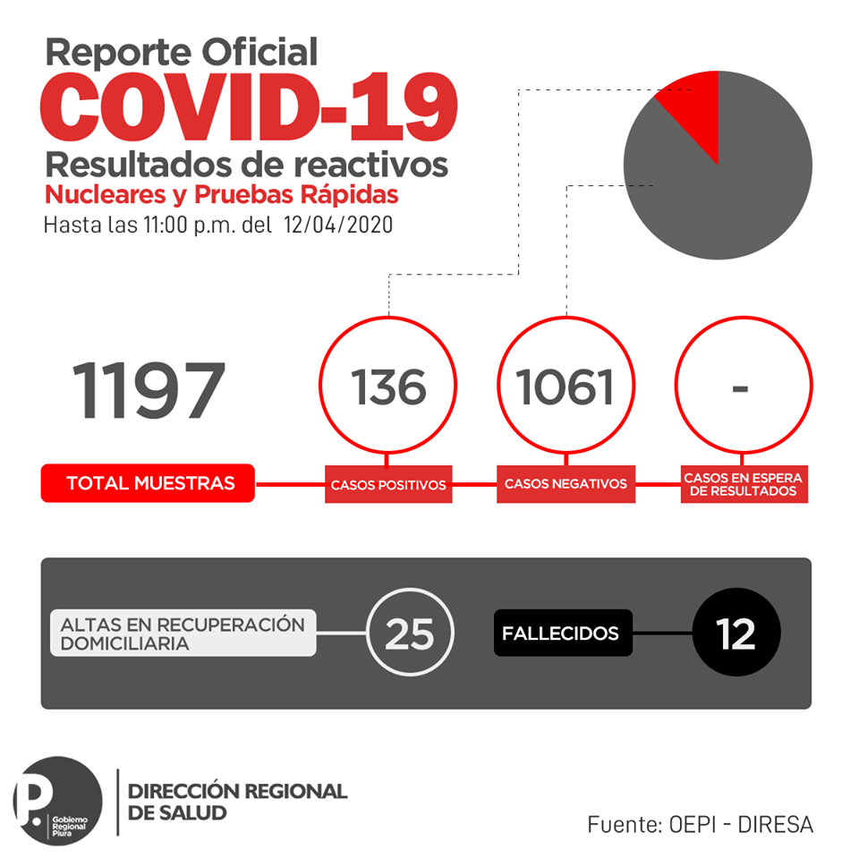 Sobre las cifras de contagiados en la región, informó que esta se mantiene en 136 confirmados y en 12 los fallecidos, desde el último sábado. “Hemos ingresado datos de pruebas rápidas pero todos han sido negativos, afortunadamente, detalló.