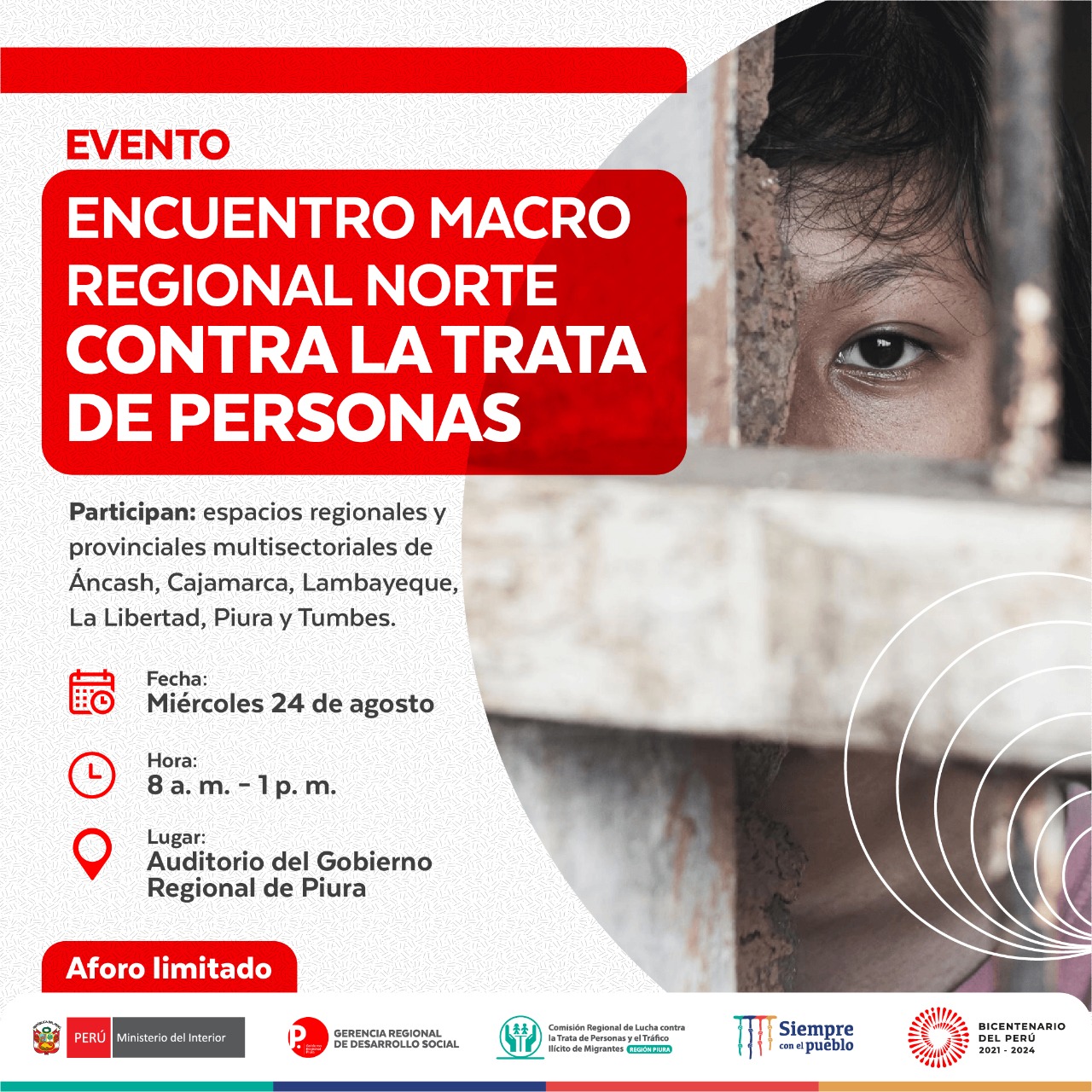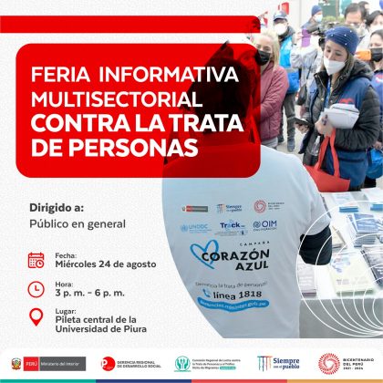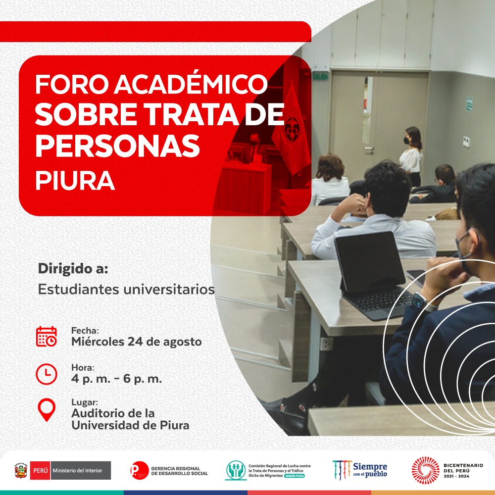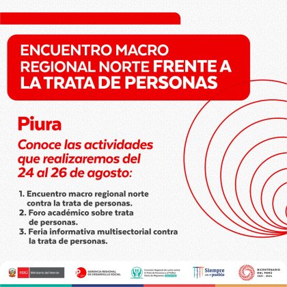 Desde el miércoles 24 hasta el viernes 26 de agosto, se realizará el I Encuentro Macro Regional Norte frente a la Trata de personas en nuestra ciudad y contará con la participación de los espacios regionales y provinciales multisectoriales de lucha contra la Trata de personas de Áncash, Cajamarca, Lambayeque, La Libertad, Piura y Tumbes.