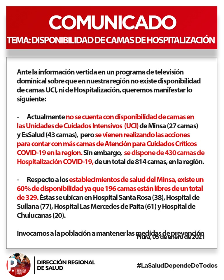 En dicho comunicado señalan que Piura no cuenta con disponibilidad de camas de UCI de Minsa ni de Essalud, pero vienen realizando las acciones correspondientes para contar con más camas para la Atención de Cuidados Críticos.