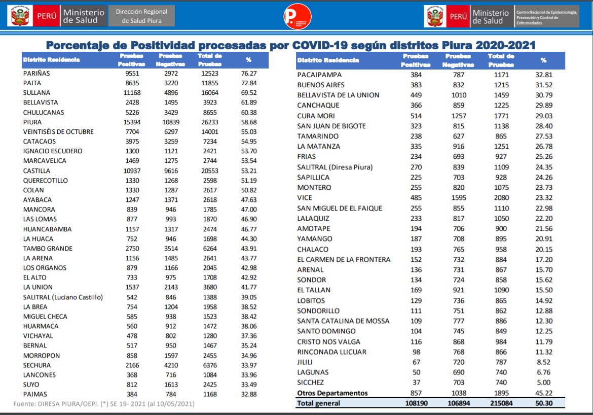 Pese a que no se encuentran en la programación del Minsa, distritos como Pueblo Nuevo de Colán y La Islilla en Paita sí están aplicando vacunas contra la Covid-19. En Colán se convocó desde el 7 de mayo a la población mayor de 90 años para aplicación de vacunas según la página de la comuna distrital.