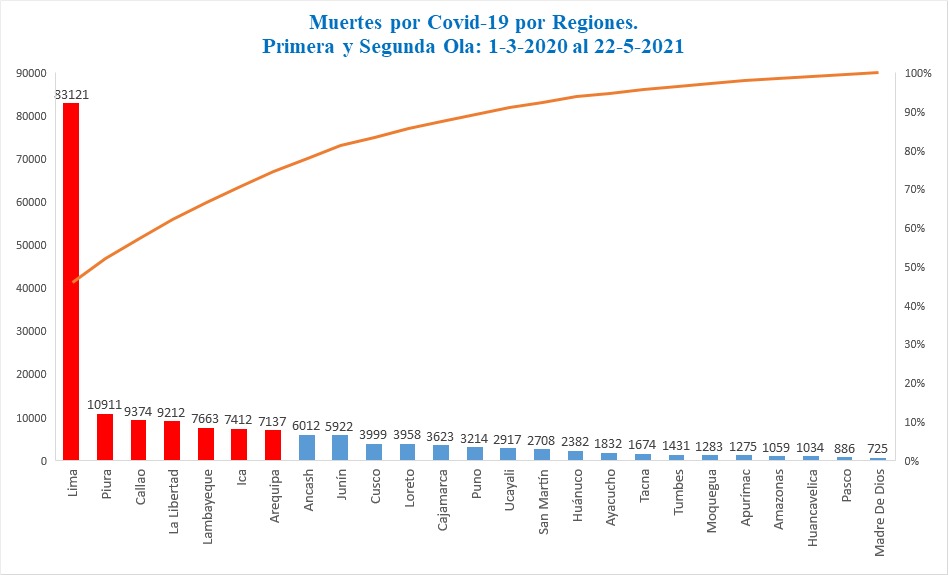 Al 31 de mayo de este año, la región Piura ya supera las 11 mil muertes a causa de la Covid-19 de acuerdo a la data sincerada y actualizada del Ministerio de Salud, con lo cual se ubica en segundo lugar a nivel nacional en fallecimientos producto de la pandemia en la primera y segunda ola, según detalló el especialista en salud pública, Julio Barrena Dioses.