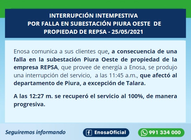 Aproximadamente a las 12:50 la empresa señaló que la interrupción del servicio se originó por una falla en la subestación de Piura-Oeste, de propiedad de Repsa, que abastece de energía eléctrica a gran parte del departamento.