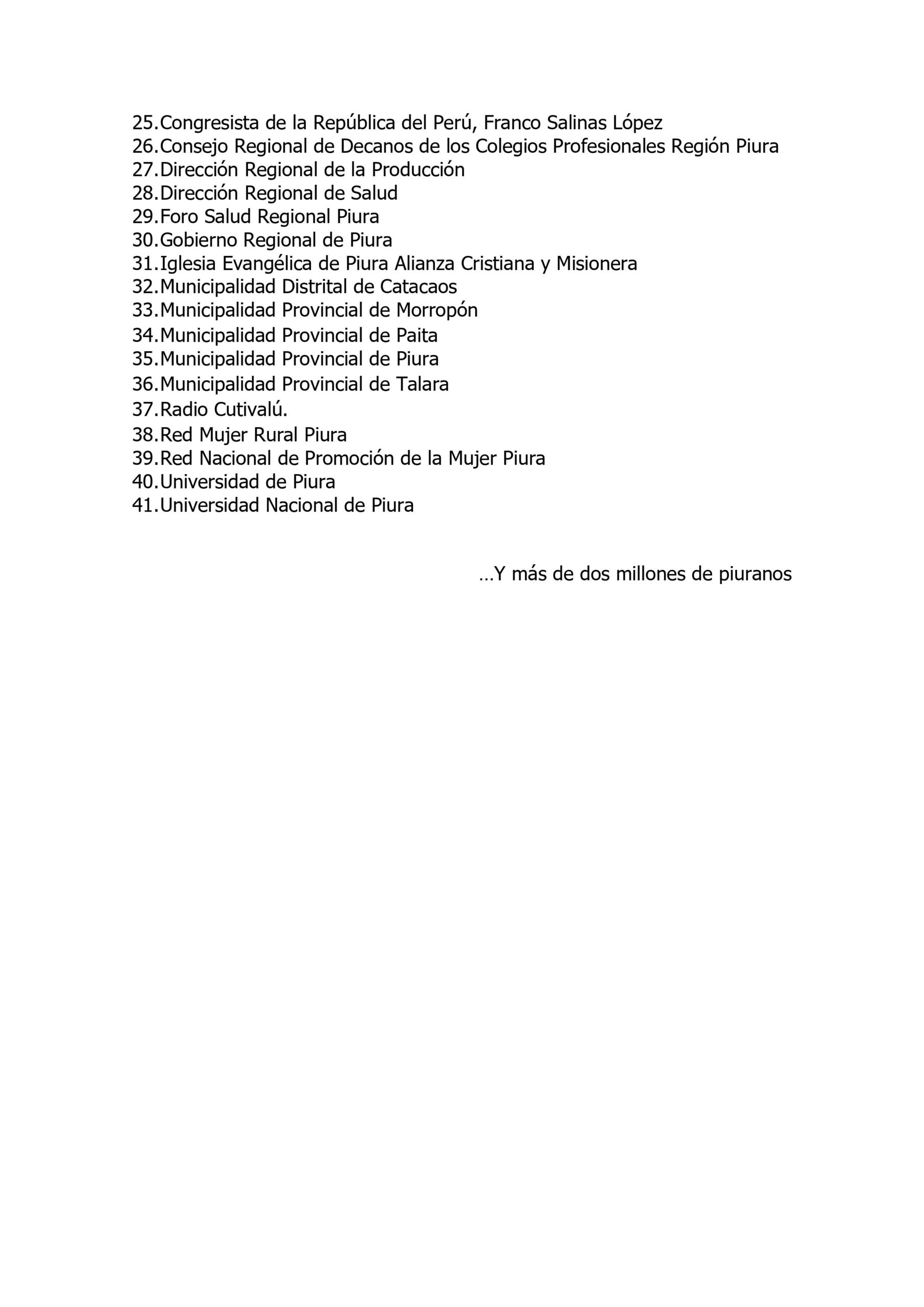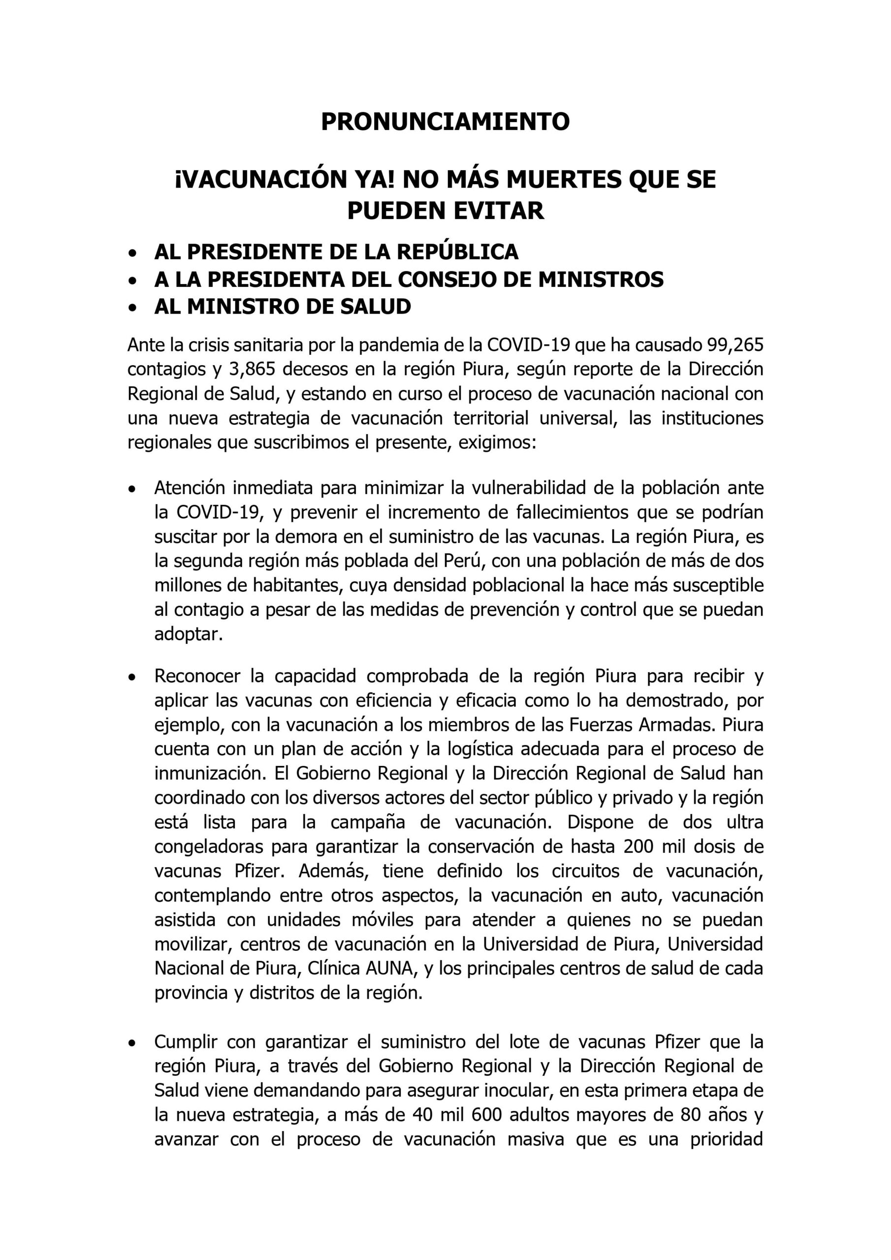 «Garantizar el suministro del lote de vacunas Pfizer que la región Piura, a través del Gobierno Regional y la Dirección Regional de Salud viene demandando para asegurar inocular, en esta primera etapa de la nueva estrategia, a más de 40 mil 600 adultos mayores de 80 años y avanzar con el proceso de vacunación masiva que es una prioridad fundamental para reducir la mortalidad, contener la transmisión de la enfermedad e impulsar la reactivación económica que coadyuvará con la recuperación del empleo y la mejora de la calidad de vida de la población», se lee en el documento.