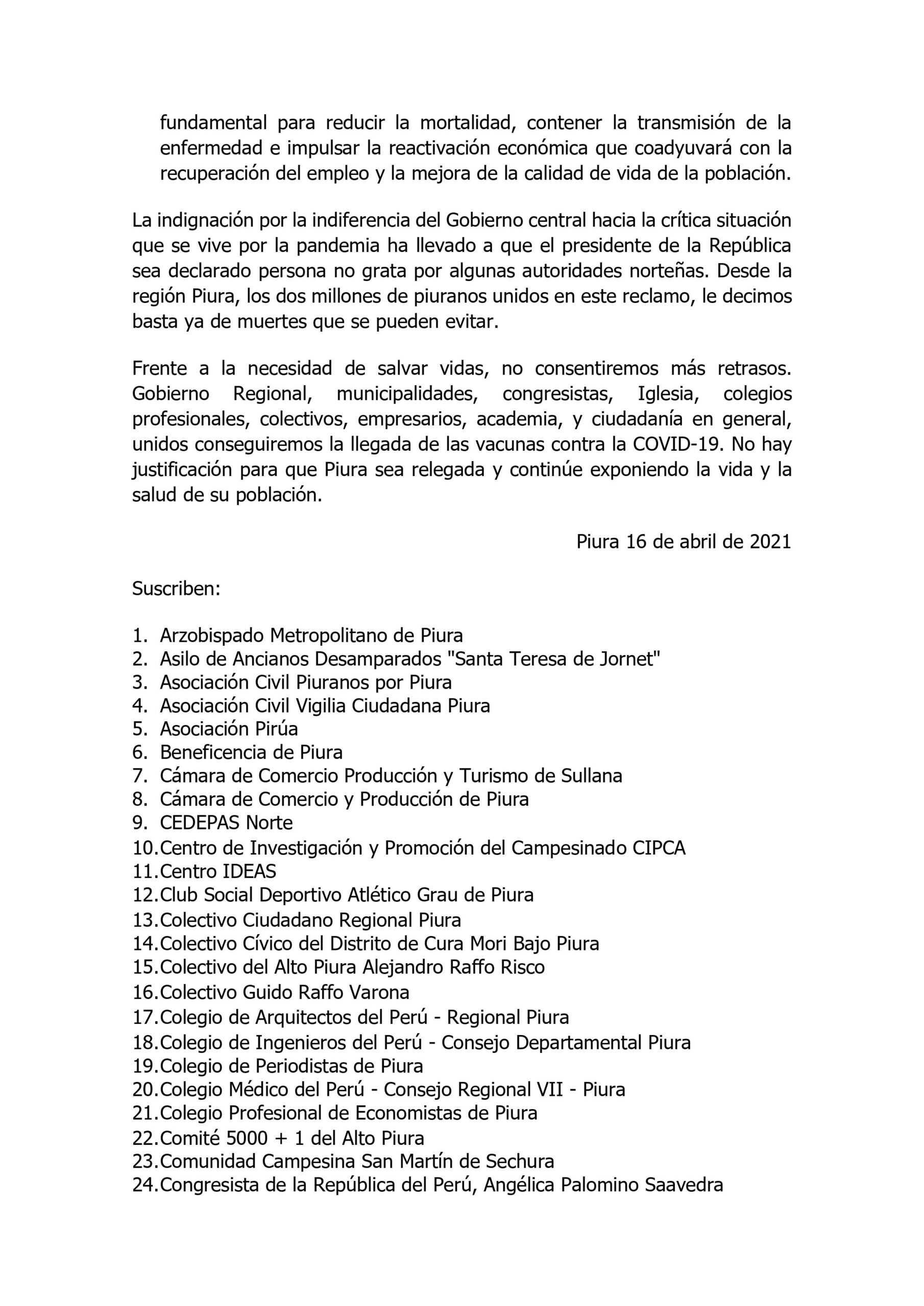 Diversas instituciones y colectivos de la sociedad civil de la Región Piura emitieron un pronunciamiento exigiendo al Ejecutivo el envío inmediato de vacunas contra la Covid para inmunizar a los adultos mayores, principal población vulnerable ante esta enfermedad.