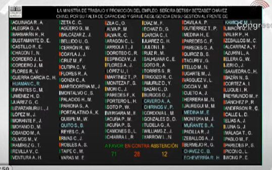 Este jueves 26 de mayo, el pleno del Congreso censuró a la ministra de Trabajo y Promoción del Empleo, Betssy Chávez, tras los cuestionamientos sobre el manejo de su sector. La moción fue aprobada con 71 votos a favor, 28 en contra y 12 abstenciones. La también congresista de Perú Democrático deberá dejar el cargo en los próximos días.