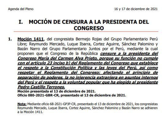 El pleno del Congreso de la República verá la moción de censura en contra de la presidenta de la Mesa Directiva, María del Carmen Alva, este jueves 16 de diciembre. La iniciativa propuesta por el congresista de Perú Libre, Guillermo Bermejo, se debe al pedido que habría hecho Alva a los diputados españoles para que se pronuncien sobre una supuesta “ilegitimidad” en el Gobierno del presidente Pedro Castillo, así como un llamado por una presunta “captura por el comunismo” en nuestro país.