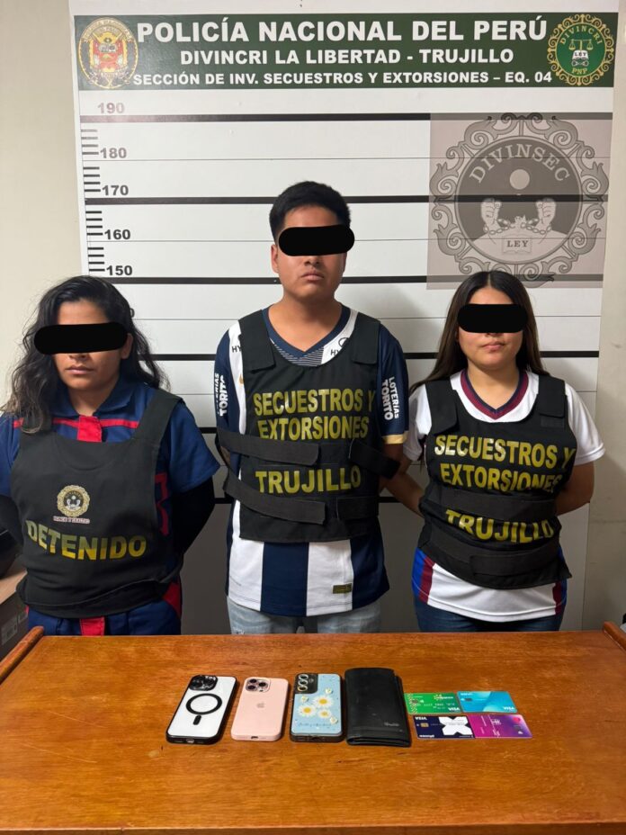 La banda habría estado cometiendo actos extorsivos en agravio de un ciudadano. Gracias al trabajo de los investigadores de la DIVINCRI TRUJILLO, se logró la detención de los integrantes de la banda y la incautación de especies, incluyendo equipos celulares y tarjetas de débito.