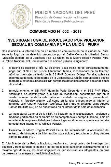 A través de un comunicado, la Policía Nacional informó que ha iniciado una investigación e intensificado la búsqueda de Llimy Andrés Santos Bautista, detenido por el presunto delito de violación sexual y que fugó de la Comisaría de La Unión, en el Bajo Piura.