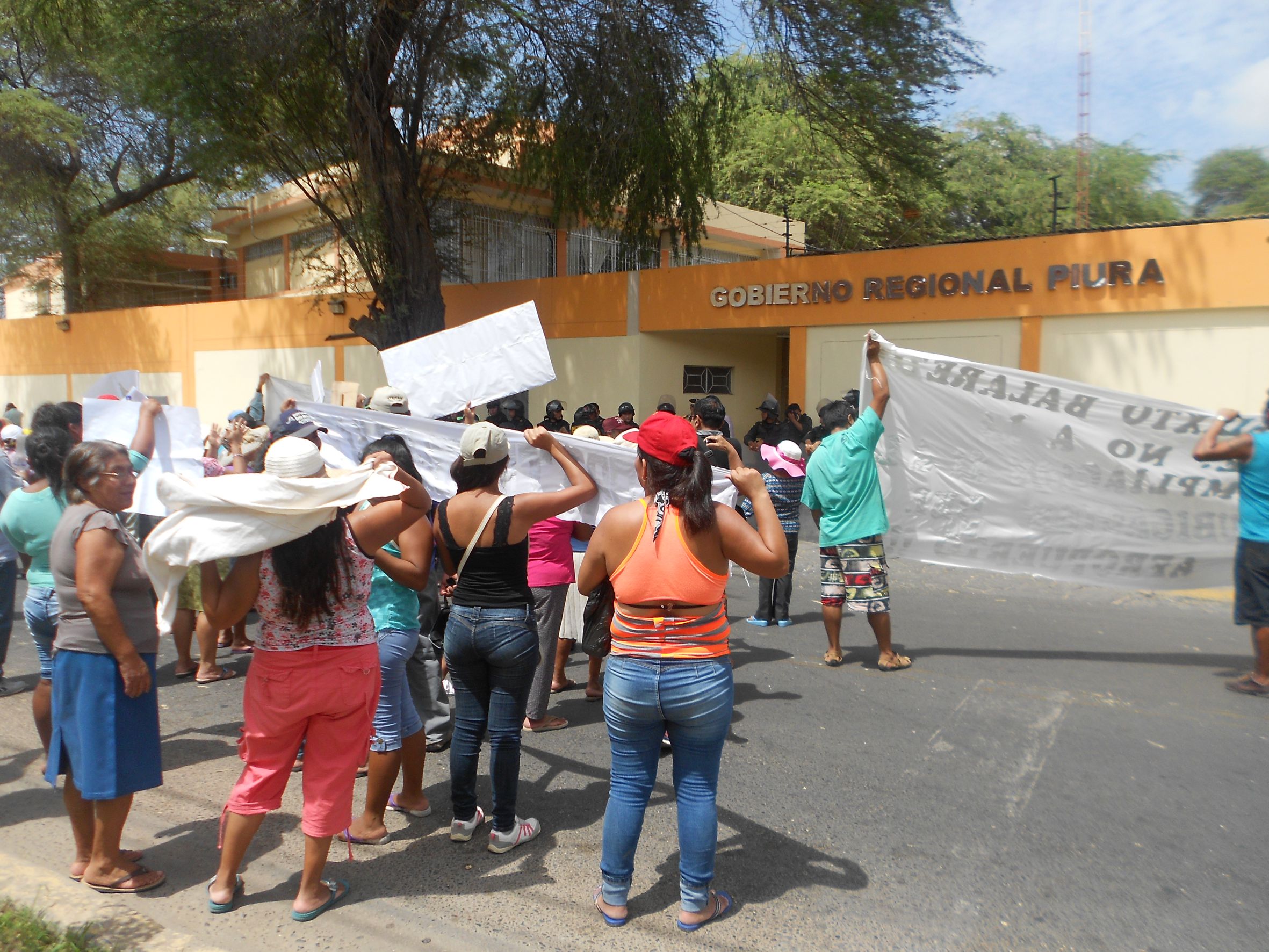La población de los asentamientos humanos castellanos Talarita, El Indio, Canal de Balarezo y Campo Polo protestaron en el frontis del gobierno regional para exigir la reubicación del aeropuerto Concha Ibérico.