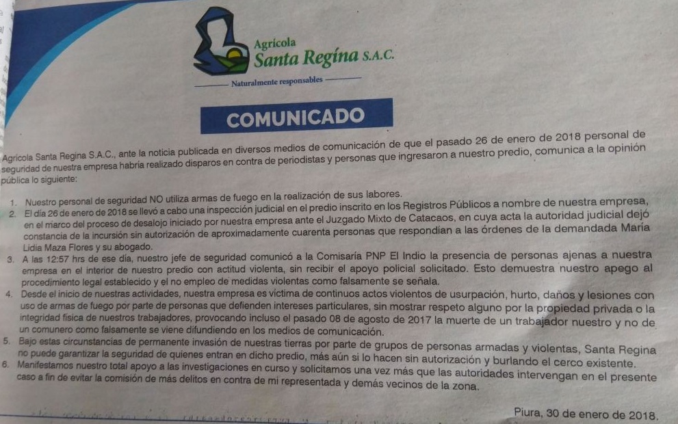 Según el comunicado, de fecha 30 de enero, la empresa Santa Regina S.A.C. indica principalmente: “Nuestro personal de seguridad no utiliza armas de fuego en la realización de sus labores”, negando ser responsables de los actos vandálicos protagonizados en el Km. 965. Agrega que el 26 de enero personas ajenas a su empresa entraron a sus predios en actitud violenta.