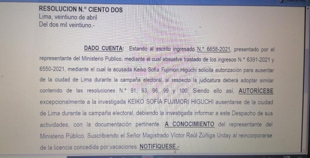 “Siendo ello así, autorícese excepcionalmente a la investigada Keiko Sofía Fujimori Higuchi ausentarse de la ciudad de Lima durante la campaña electoral, debiendo la investigada informar a este despacho de sus actividades, con la documentación pertinente”, dice la resolución número 102.