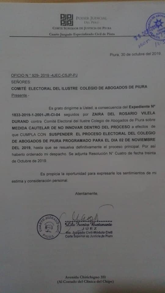 Tras los últimos cuestionamientos de las elecciones en el Colegio de Abogados de Piura, la colegiada Zaira Vilela Durand, presentó una medida cautelar contra este proceso electoral.