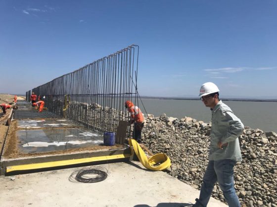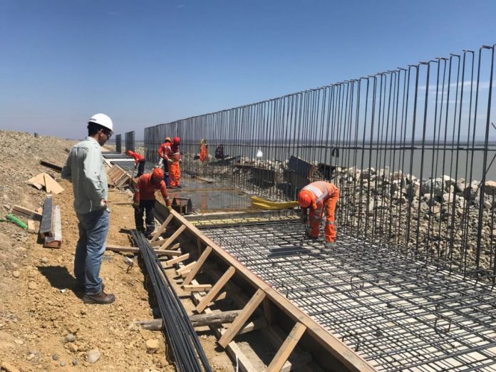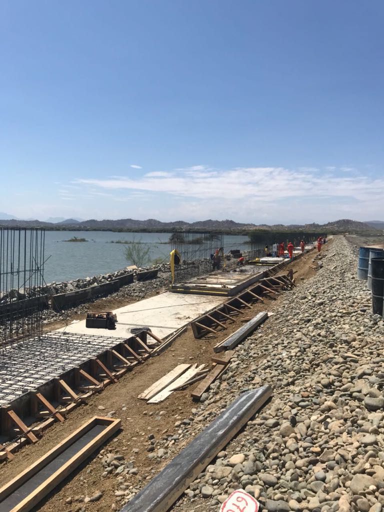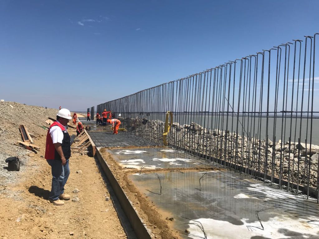 La obra forma parte del Plan Integral de la Reconstrucción con Cambios. El Consorcio Hidráulico Poechos viene armando la estructura de los nuevos muros que aumentará el almacenamiento del vaso regulador en 200 millones de metros cúbicos de agua, los mismos que son sostenidos por una base de concreto y fierro.