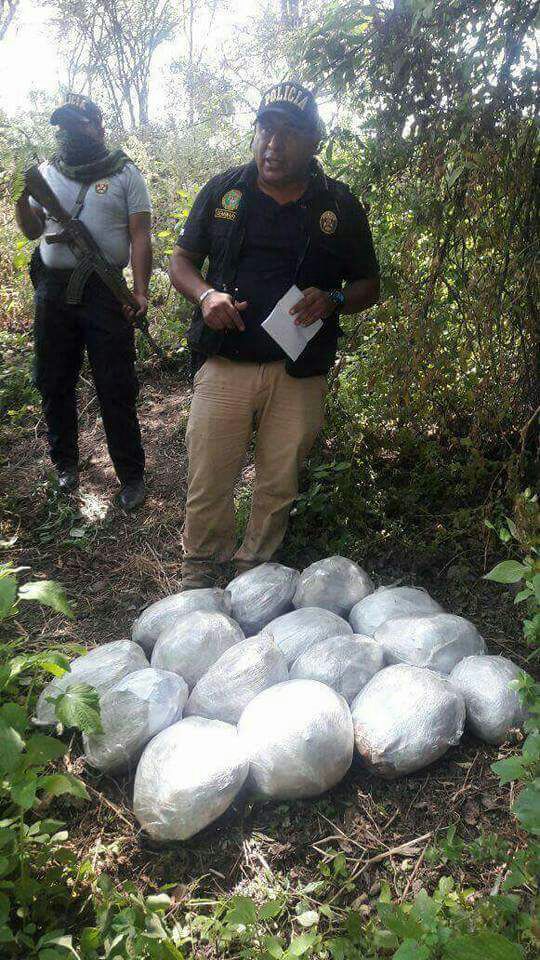 Este recinto rústico era hecho de quincha y estaba camuflado en una manta negra la cantidad de 3 kilos procesados de marihuana, 15 paquetes tipo ovoides precintados que suman un peso aproximado de 26 kilos.