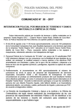 1. El día 08 de agosto a las 11:05 hrs aproximadamente, cerca de 150 pobladores de la Comunidad Campesina San Juan Bautista ingresaron a los terrenos agrícolas de la empresa “Santa Regina SAC” ubicados en el Caserío Nuevo Santa Rosa, distrito de Cuna Mori – Piura, causando daños materiales a los equipos y maquinarias, reteniendo además a los trabajadores del lugar.