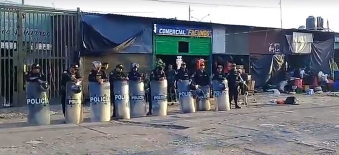Personal de la Municipalidad de Piura y la Policía forman escuadras en los puntos críticos del mercado de Piura para evitar que los comerciantes ambulantes vuelvan a tomar las calles.