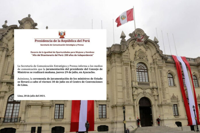 Inicialmente, estaba previsto que los titulares de las diferentes carteras juraran al cargo este miércoles 28 de julio a las 4.30 p. m. en el Centro de Convenciones de Lima, según el programa que seguiría Castillo Terrones y que fue remitido desde Palacio de Gobierno.