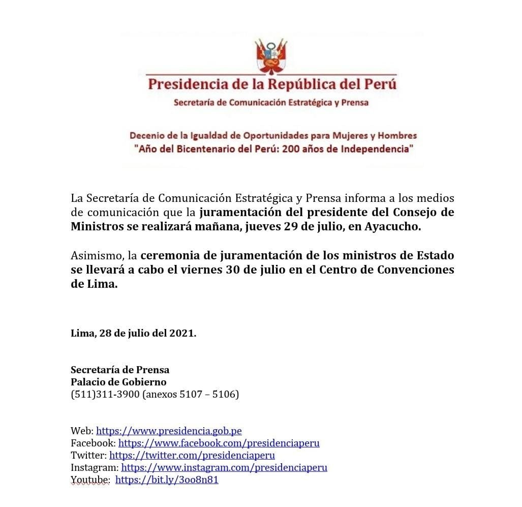 Asimismo, la juramentación del presidente del Consejo de Ministros será el jueves 29 de julio en Ayacucho. El evento ocurrirá en esta región debido a que el mandatario participará en una ceremonia simbólica de toma de mando en la Pampa de la Quinua.