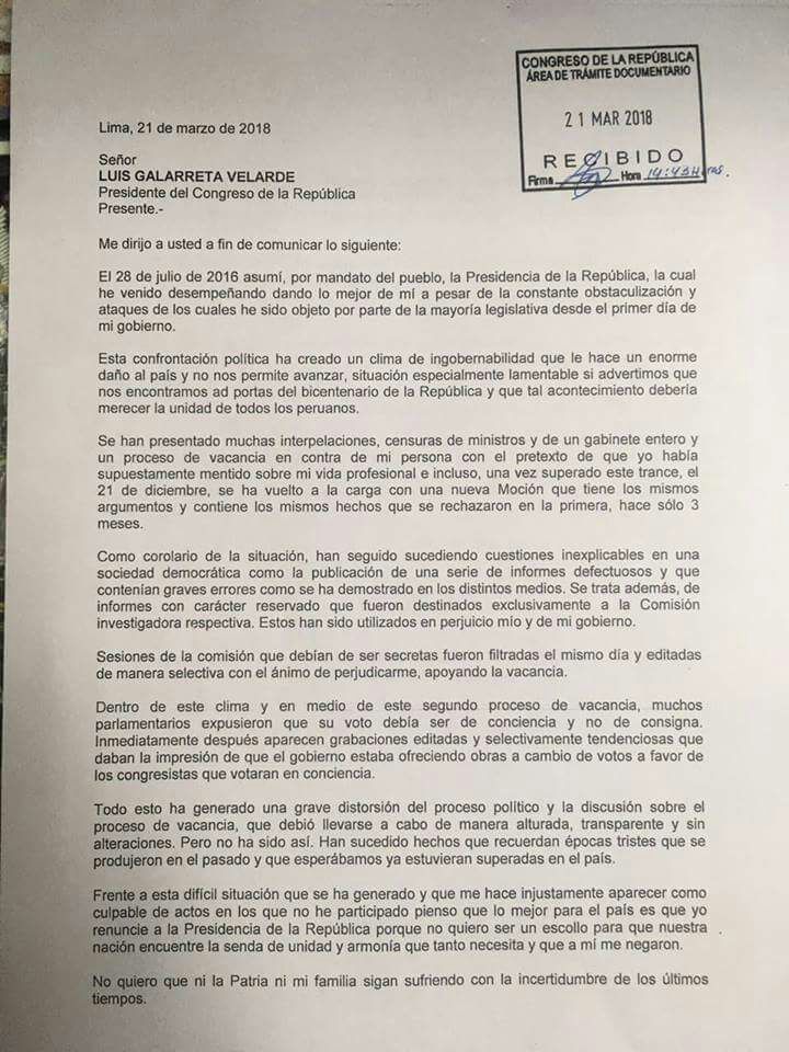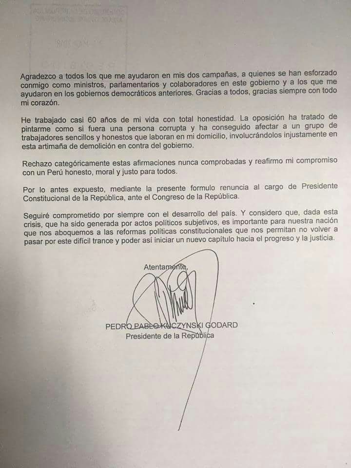 Pedro Pablo Kuczynski no es más presidente del Perú. Mediante un mensaje a la Nación transmitido a las 2:40 p.m. de esta tarde confirmó su renuncia al cargo.