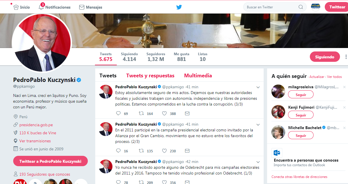 Estoy absolutamente seguro de mis actos. Dejemos que nuestras autoridades fiscales y judiciales trabajen con autonomía, independencia y libres de presiones políticas. Estamos comprometidos en la lucha contra la corrupción», escribió PPK.