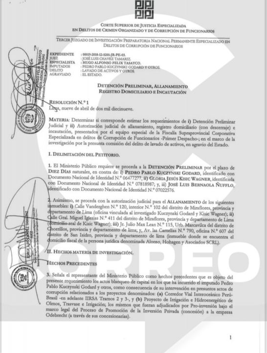 «Señala el representante del Ministerio Público como hechos precedentes que es objeto del presente requerimiento los actos de blanqueo de capital en los que ha incurrido el imputado Pedro Pablo Kuczynski Gordard y otros, como consecuencia de su intervención en presuntos actos de corrupción denominados: (a) Corredor Vial Interoceánico Perú – Brasil -en adelante IIRSA Tramos 2 y 3, y (b) Proyecto de Irrigación e Hidroenergético de Olmos, Trasvase de Irrigación; los mismos que fueran adjudicados por Pro-Inversión bajo el marco legal del Proceso de Promoción de la Inversión Privada (concesión) a la empresa Odebrecht (a través de sus concesionarias)», se lee en la resolución.