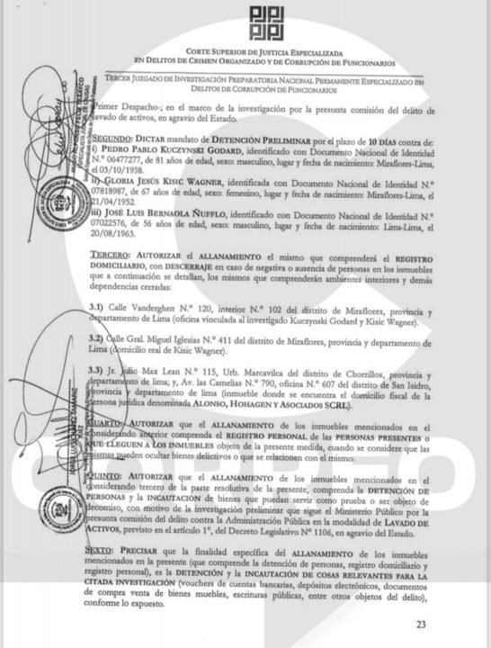 Un medio nacional difundió los documentos del  Poder Judicial que ordenan la detención preliminar por 10 días contra el expresidente Pedro Pablo Kuczynski por el presunto delito de lavado de activos.