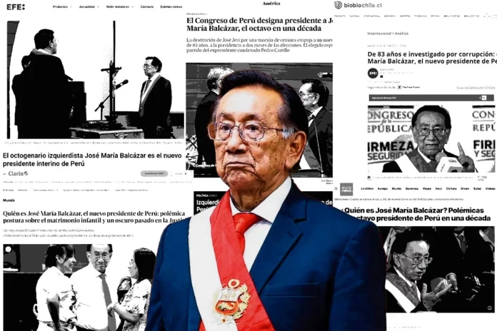 La designación de José María Balcázar como presidente interino del Perú tuvo inmediata repercusión en la prensa internacional. Su elección como titular de la Mesa Directiva del Congreso, con 64 votos frente a los 46 obtenidos por María del Carmen Alva, fue cubierta por medios de América, Europa y otras regiones que coincidieron en dos ejes: la crisis institucional peruana y el perfil polémico del nuevo mandatario.