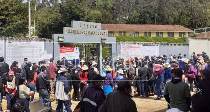 Una preocupante aglomeración se reporta en la IE 15019 del distrito de Ayabaca por la demora en la instalación de las mesas de sufragio. Los electores ignoran la invocación que hacen los miembros de la FFAA para guardar el distanciamiento.