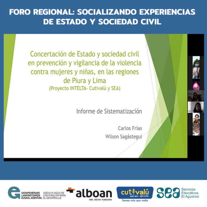 Este evento al que se le ha denominado “Foro regional: presentación de resultados de la sistematización, mujeres y niñas libres de violencia” es el recojo de información basada en testimonios de las y los participantes de Sociedad Civil y Estado en su experiencia con el proyecto “Concertación de Estado y sociedad civil en prevención y vigilancia de la violencia contra mujeres y niñas, en las regiones de Piura y Lima» ejecutado por Cutivalú y Sea en consorcio con la Agencia Vasca y Alboan.