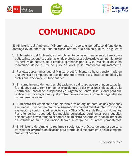 A través de un comunicado publicado en sus redes sociales, el Minam aseguró que tiene como política de la institución designar profesionales “bajo estricto cumplimiento de los perfiles de puestos de la entidad, aprobados por Servir”