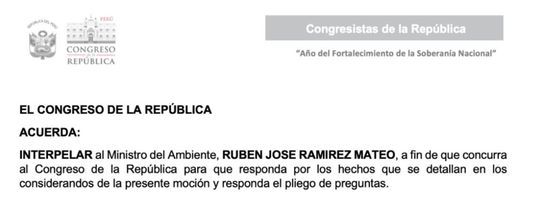 Con esto buscarán que el titular del Minam acuda al Congreso para responder a un pliego interpelatorio sobre los presuntos favorecimientos a mientros de Perú Libre.