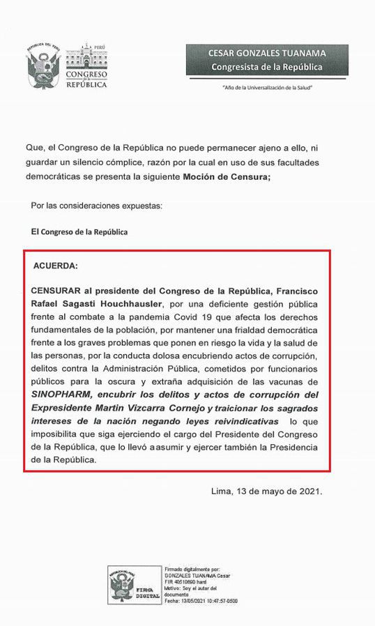 El congresista César Gonzáles, de la bancada Descentralización Democrática, presentó una nueva moción de censura contra el presidente de la República, Francisco Sagasti, con el fin de que sea vista en el pleno del Parlamento Nacional este jueves 13 de mayo.