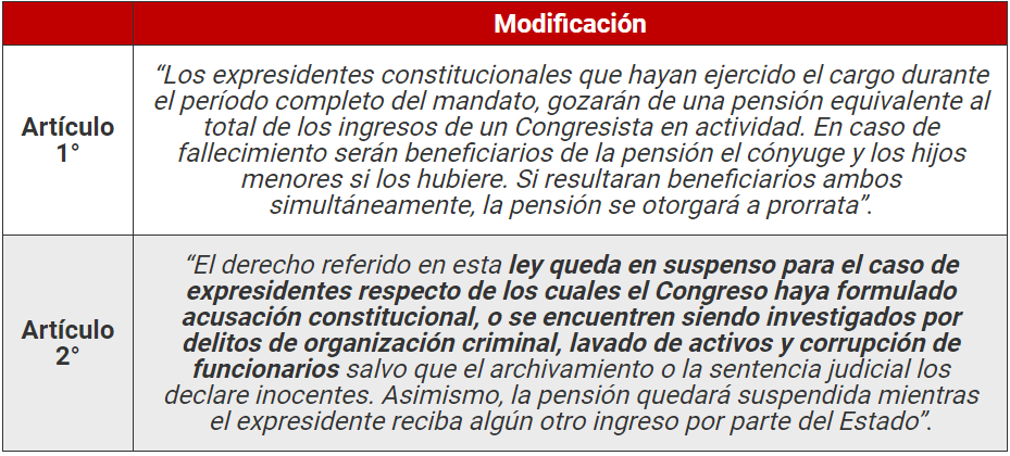 El grupo parlamentario Avanza País, a iniciativa de la congresista Patricia Chirinos, propuso un proyecto de ley para eliminar la pensión vitalicia a expresidentes de la República que se encuentren investigados o con sentencia firme por organización criminal, corrupción y lavado de activos.
