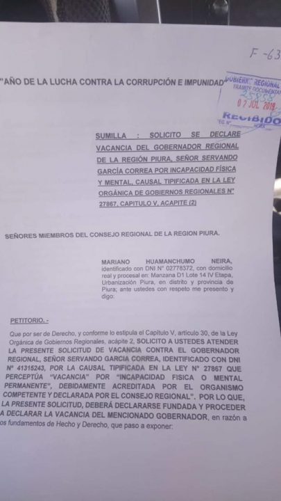 El ciudadano Mariano Humanchumo Neira presentó ante el Consejo regional de Piura la solicitud de vacancia contra el gobernador regional de Piura, Servando García Correa “por incapacidad física y mental permanente”.