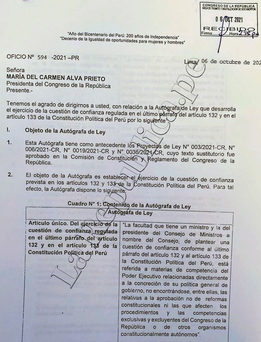 El presidente Pedro Castillo presentó este miércoles 06 de octubre un oficio ante el Congreso, planteando la observación a la autógrafa de ley interpretación auténtica de la cuestión de confianza que había aprobado este poder del estado.