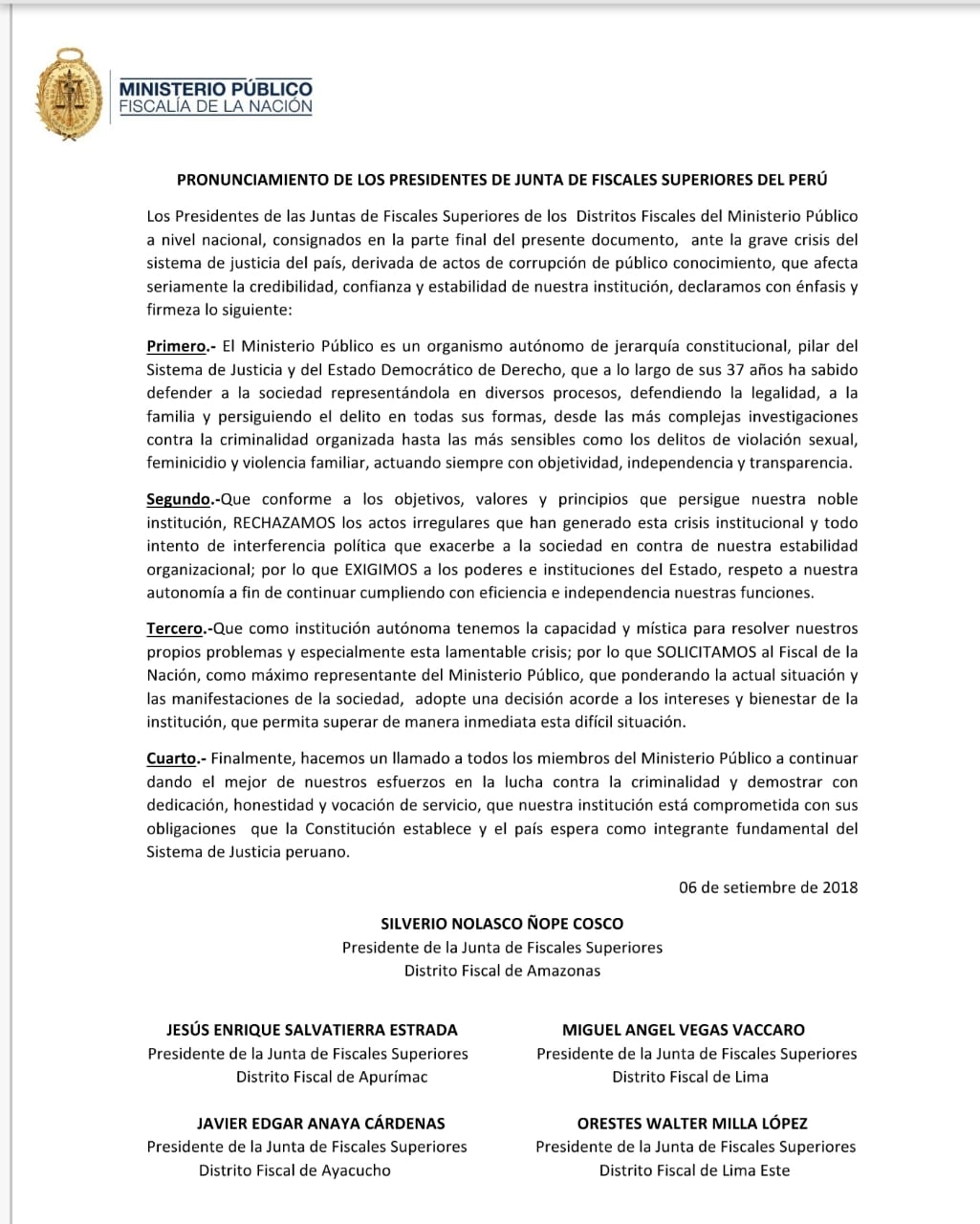 A través de un comunicado, la mayoría de los presidentes que integran la Junta de Fiscales Superiores del Perú se pronunciaron sobre la actual crisis en el Ministerio Público, en el sistema de justicia en el país, que fue ocasionada por actos de corrupción.
